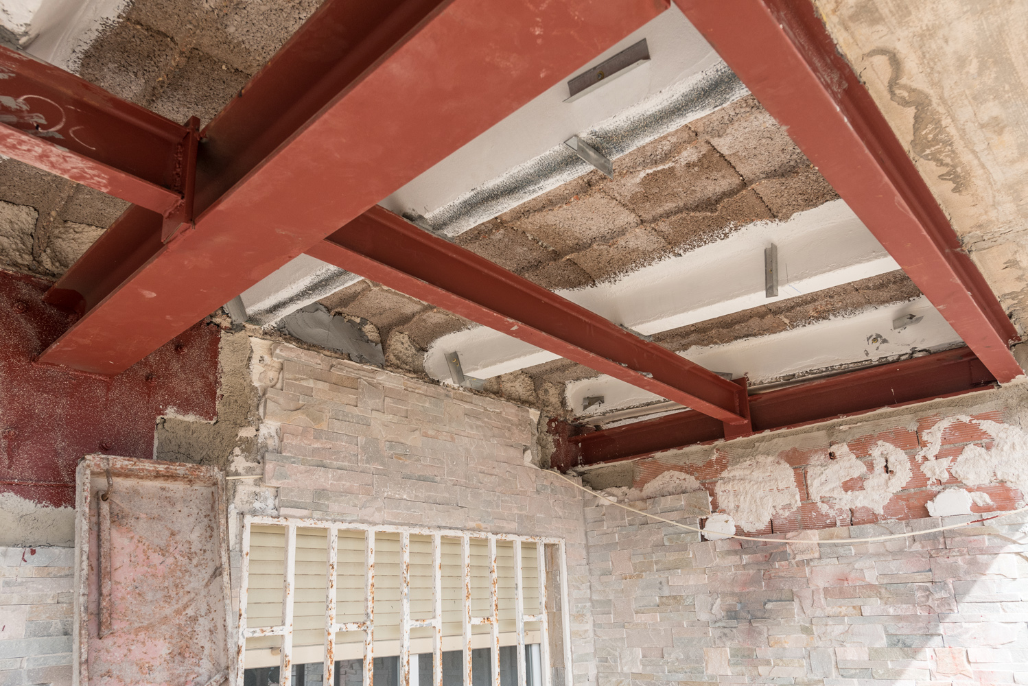 Refuerzo estructural de las terrazas con perfilería metálica y refuerzo de pilares deteriorados en sótano. Impermeabilización de terrazas y cambio de solado.