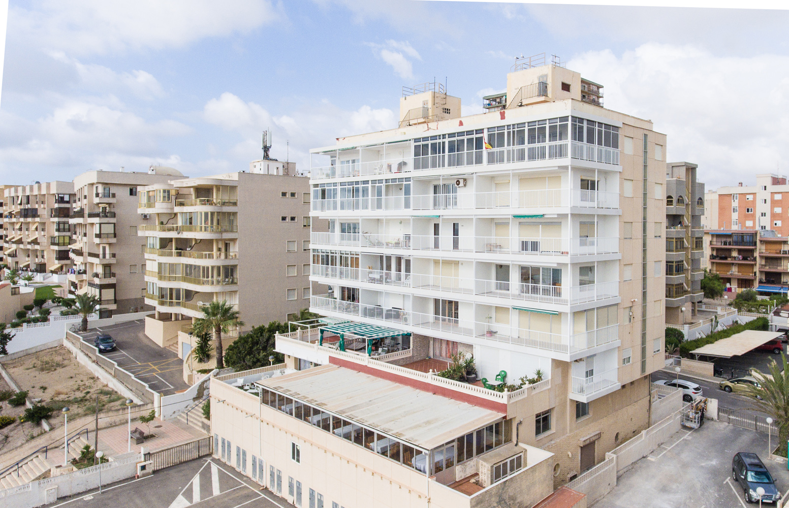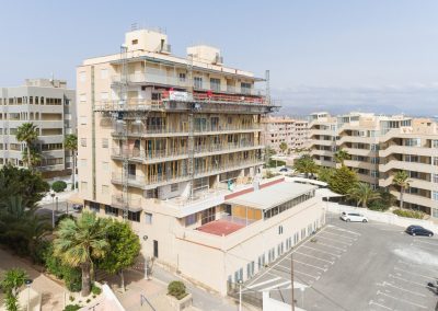 Demolición de cerramientos para descubrir las cabezas de los pilares. Desmontaje de acristalamientos y cerramientos de aluminio que interfieren con los trabajos. Desmontaje de las barandillas. Colocación de collarines de chapa de acero en las cabezas de los pilares para soldar ménsulas de sujección de los forjados de las terrazas, colocación de ménsulas intermedias con anclajes especiales a las jácenas de la primera crujía a la terraza, soldadura de perfiles longitudinales de atado y apoyo de los forjados, entre las ménsulas. Demolición de frentes de forjado y formación de jácena de borde de forjado con hormigón. Reparación de los pilares de fachada mediante picado, limpieza y eliminación de óxidos de las armaduras y suplementado de las mismas con barras de acero corrugado en caso de ser necesario, pasivado de armaduras y restitución de los volúmenes originales con mortero especial de reparación estructural, R4. En el caso de los pilares de planta 6ª, refuerzo de los mismos mediante perfiles rectangulares de acero estructural colocados en la dirección del pórtico. Restitución de cerramientos de fachada y colocación de falso techo de paneles de yeso laminado especiales para exteriores como protección y ocultación del refuerzo estructural. reposición de los cerramientos de aluminio existentes y cambio de las barandillas existentes por otras nuevas, Revestimiento de paredes con pétrea picada sobre el cotegrán para igualar partes intervenidas y no intervenidas y acabado con pintura acrílica 100% transpirable en fachadas y techos. En el suelo se procedió a la demolición de todas las capas existentes de solado, formación de pendientes y capa de compresión con hormigón estructural aligerado armado con mallazo, impermeabilización con mortero cementoso bicomponente con polímeros modificados y colocación de solado de gres porcelánico de gran formato, colocación de pieza de borde de hormigón fibroreforzado en forma de «L» ocultando también el canto del forjado.