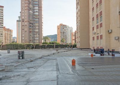 Fase uno: Formación de pendientes y nuevo colector de saneamiento para su posterior impermeabilización con lámina asfáltica autoprotegida Politaber combi 50/g fp de chova . Terminación con revestimiento de exterior para la formación de dibujo paisajístico.