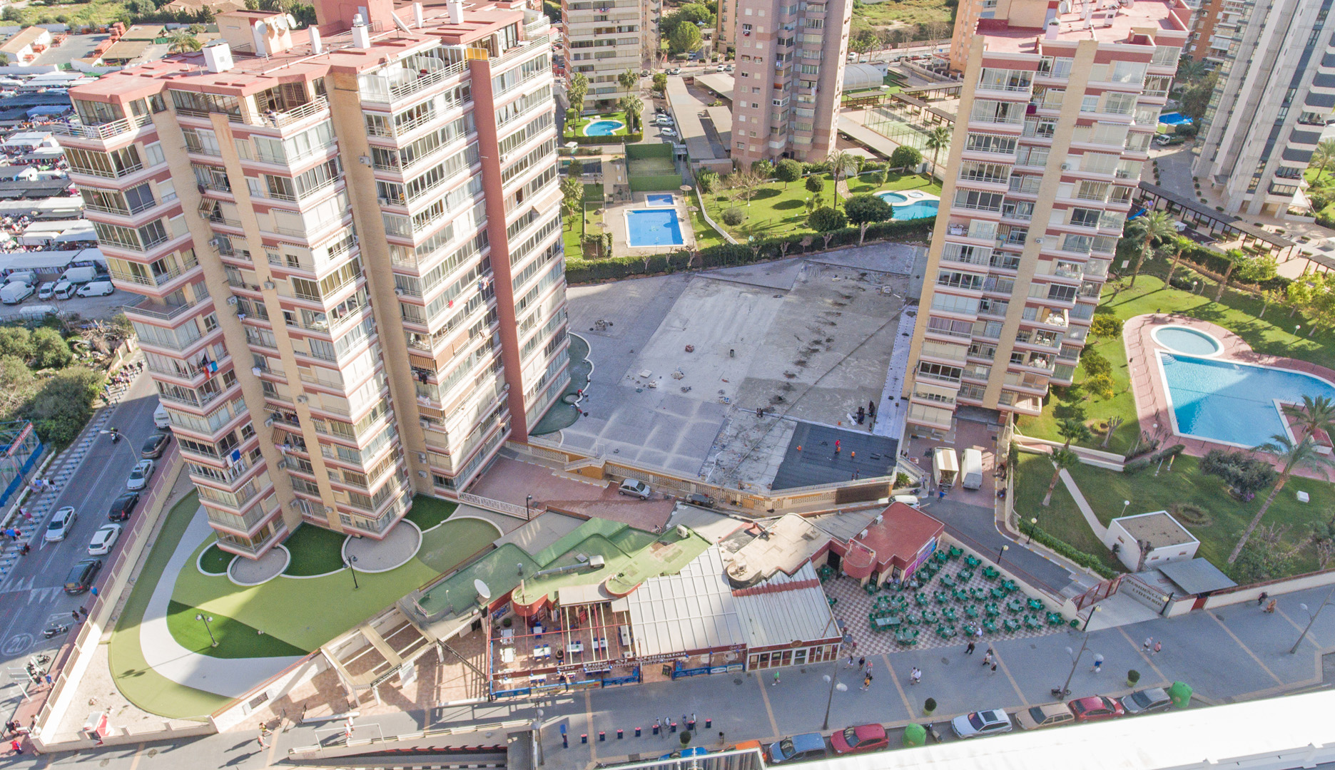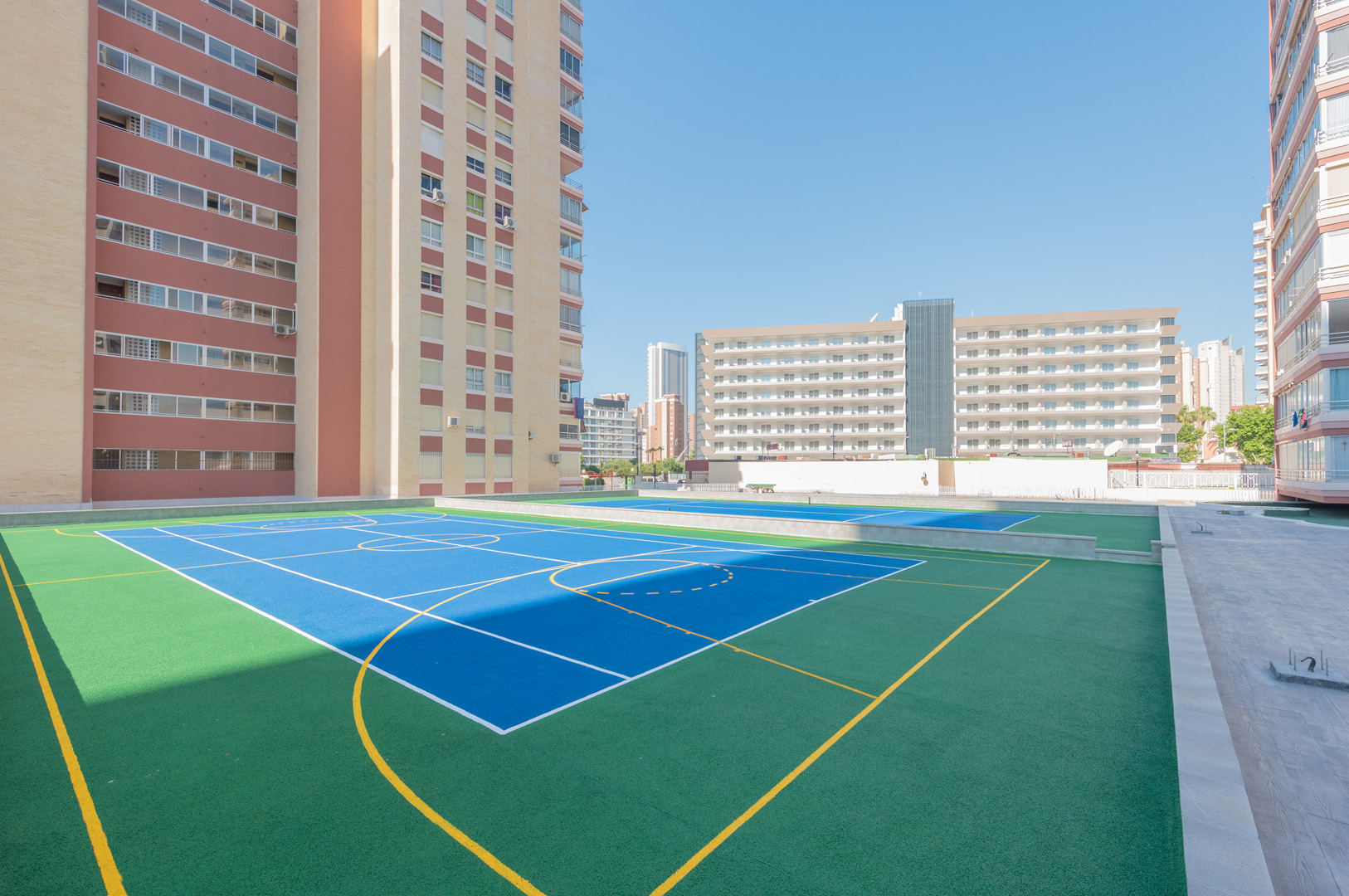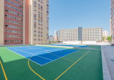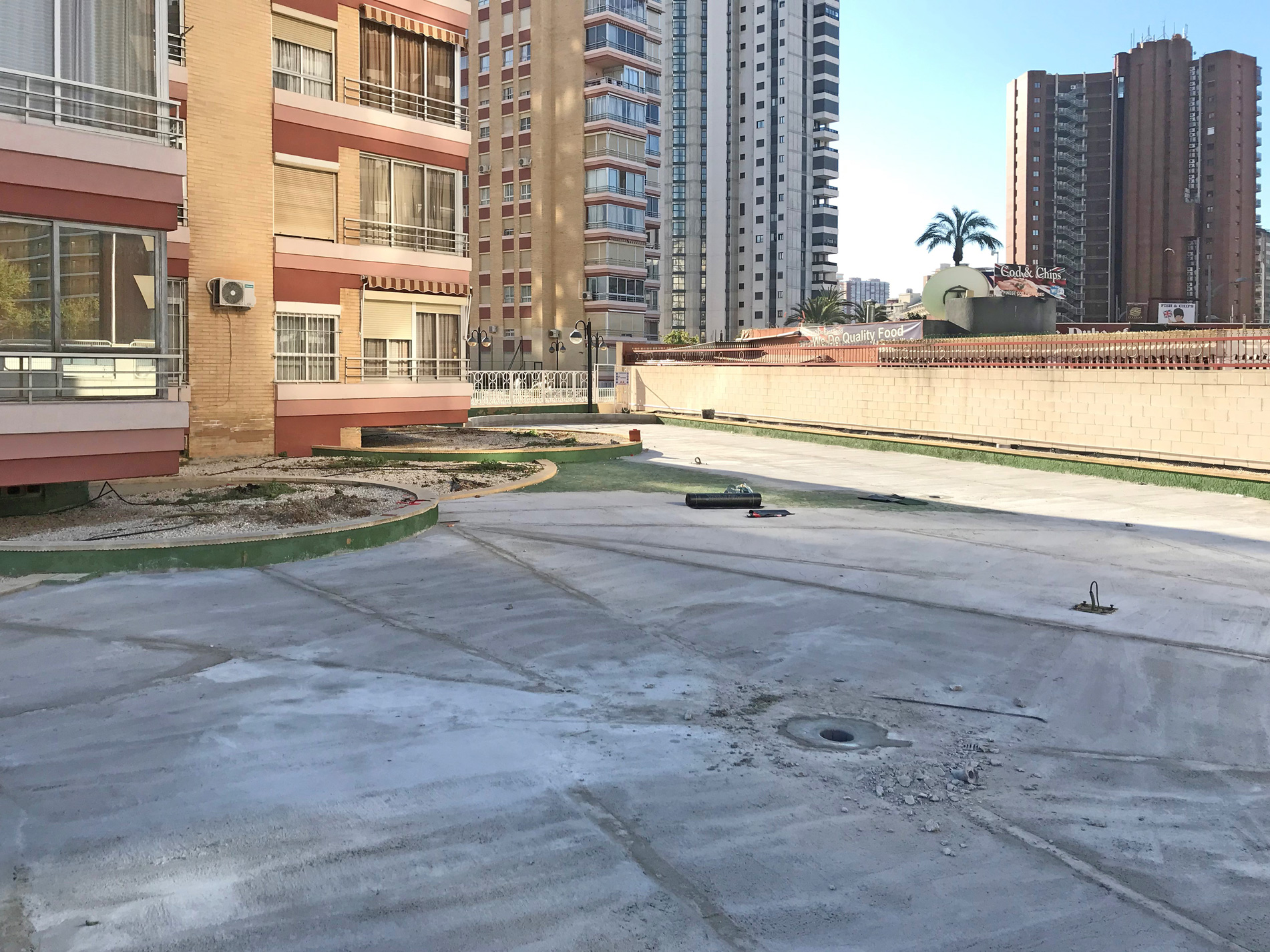 Fase dos: formación de pendientes, creación de nuevos sumideros, impermeabilización con lámina asfáltica Lbm 40 fp de chova. Terminación de explanada con hormigón impreso y creación de zona deportiva multiusos
